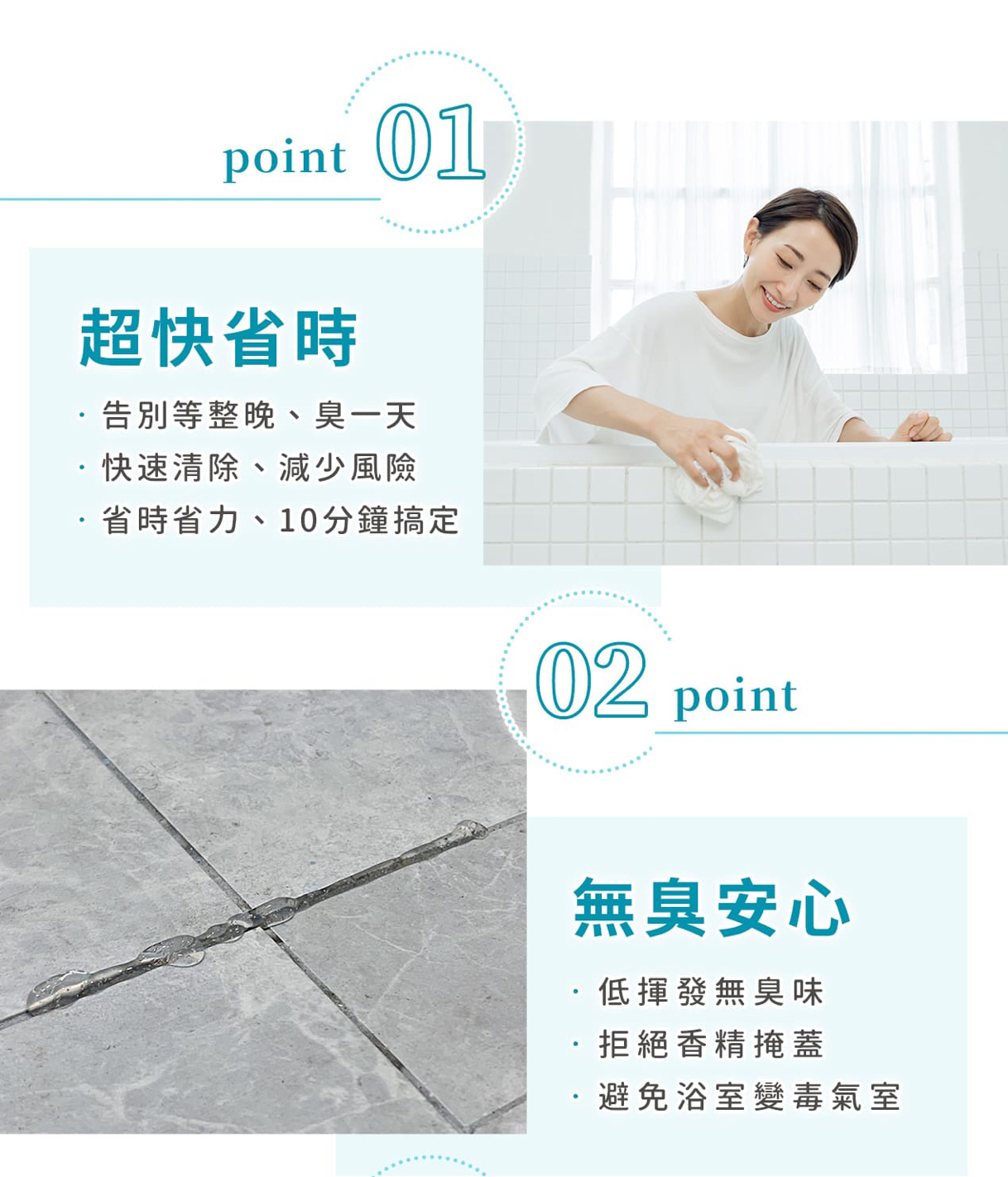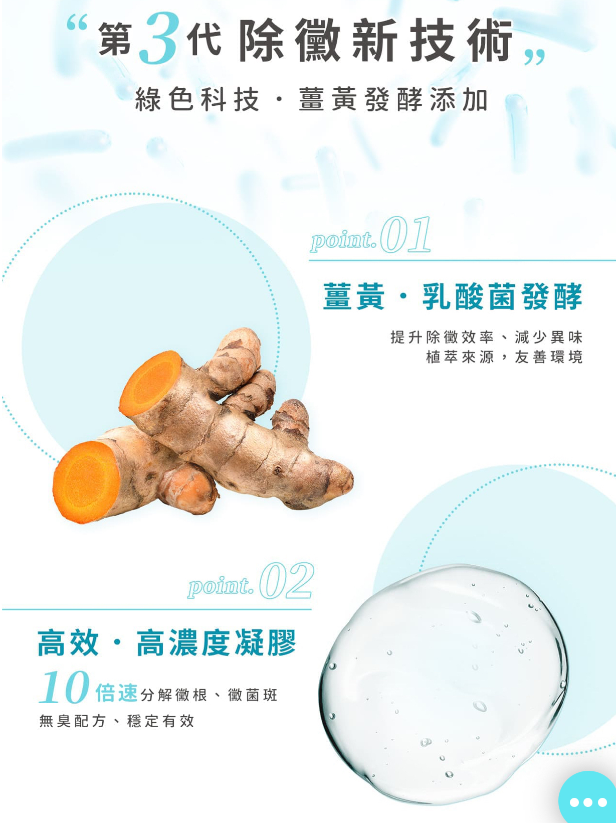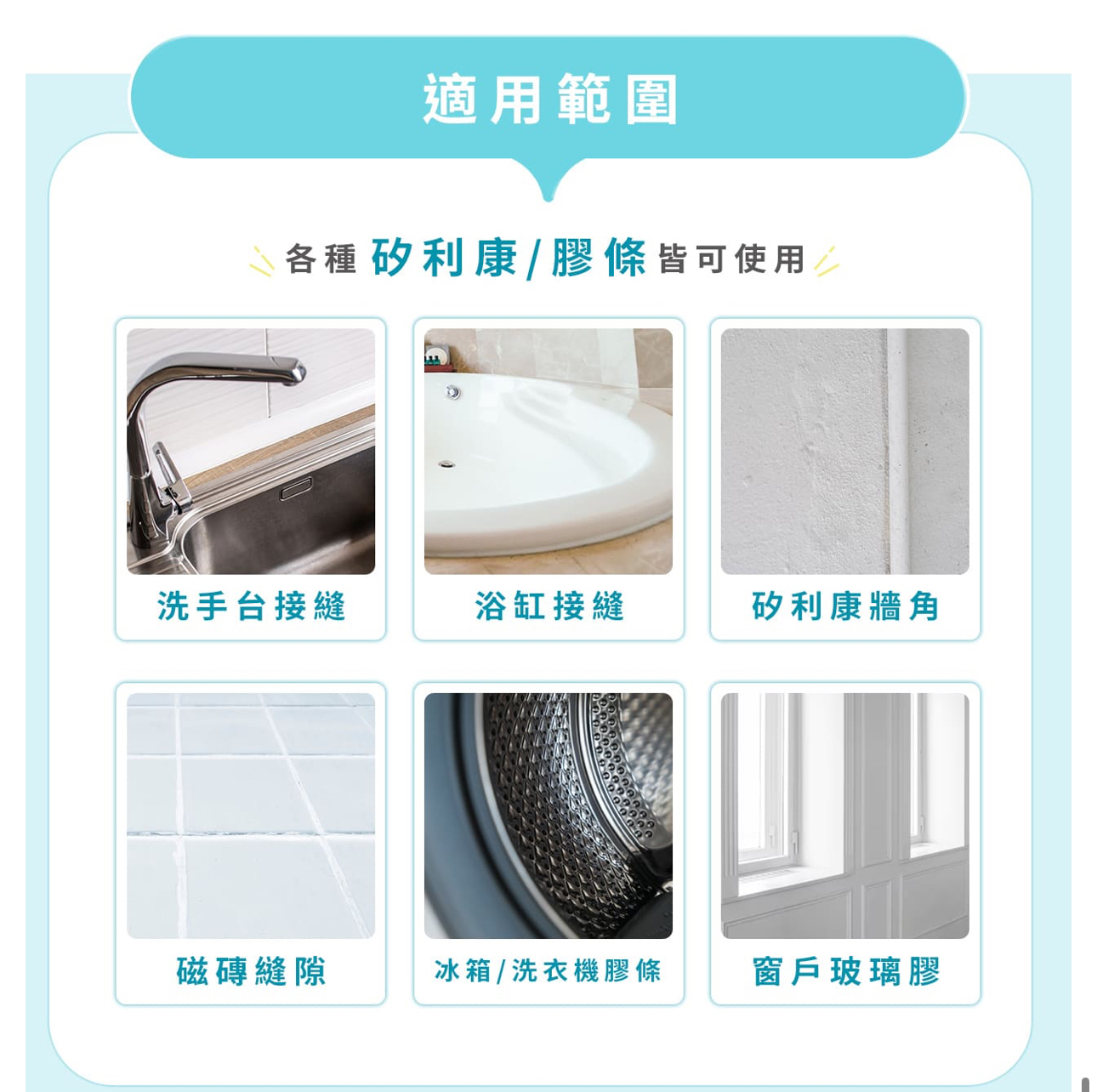 *不只擦掉表面黴菌,還能深入根部,乾淨持久看得見! *適用於矽利康、膠條、塑膠、磁磚縫等材質。 *超快速省時,塗上後靜置即可,不需刷、搓。 *無臭安心,使用過程無刺激氣味、香精遮蓋。 *尖嘴設計,縫隙、角落、膠條出膠精準塗抹。 = 品名 速效除黴凝膠 150ml 容量 150ML 產地 台灣 成分 次氯酸鈉 適用範圍 浴室、廚房等磁磚間隙,矽利康、塑膠膠條等發黴處。 使用建議 1.使用前請保持表面乾燥。 2.擠出適量凝膠塗抹在黴斑處。 3.靜置10-30分鐘(視黴斑嚴重程度) 4.清水洗淨即可。 保存方法 請置於陰涼乾燥處,避免陽光直射,以防變質。 ★注意事項★ *使用前先將、表面污垢擦掉,並保持目標處乾燥,再上除黴凝膠效果會更好呦! *除黴凝膠為「鹼性產品」,不適用電鍍、不鏽鋼、鋁等金屬製品、天然石材、人造石、琺瑯等材質,使用前請務必留意材質限制。 其他注意事項: 1.開封後盡速使用完畢。 2.本產品為鹼性,請避免與其他洗滌產品混合使用。 3.請勿使用於壁紙、木頭、金屬等材質處。 4.使用時請帶手套,避免接觸皮膚。 5.若滴入眼睛,請立即用水沖洗,仍有不適請洽詢專業醫師。