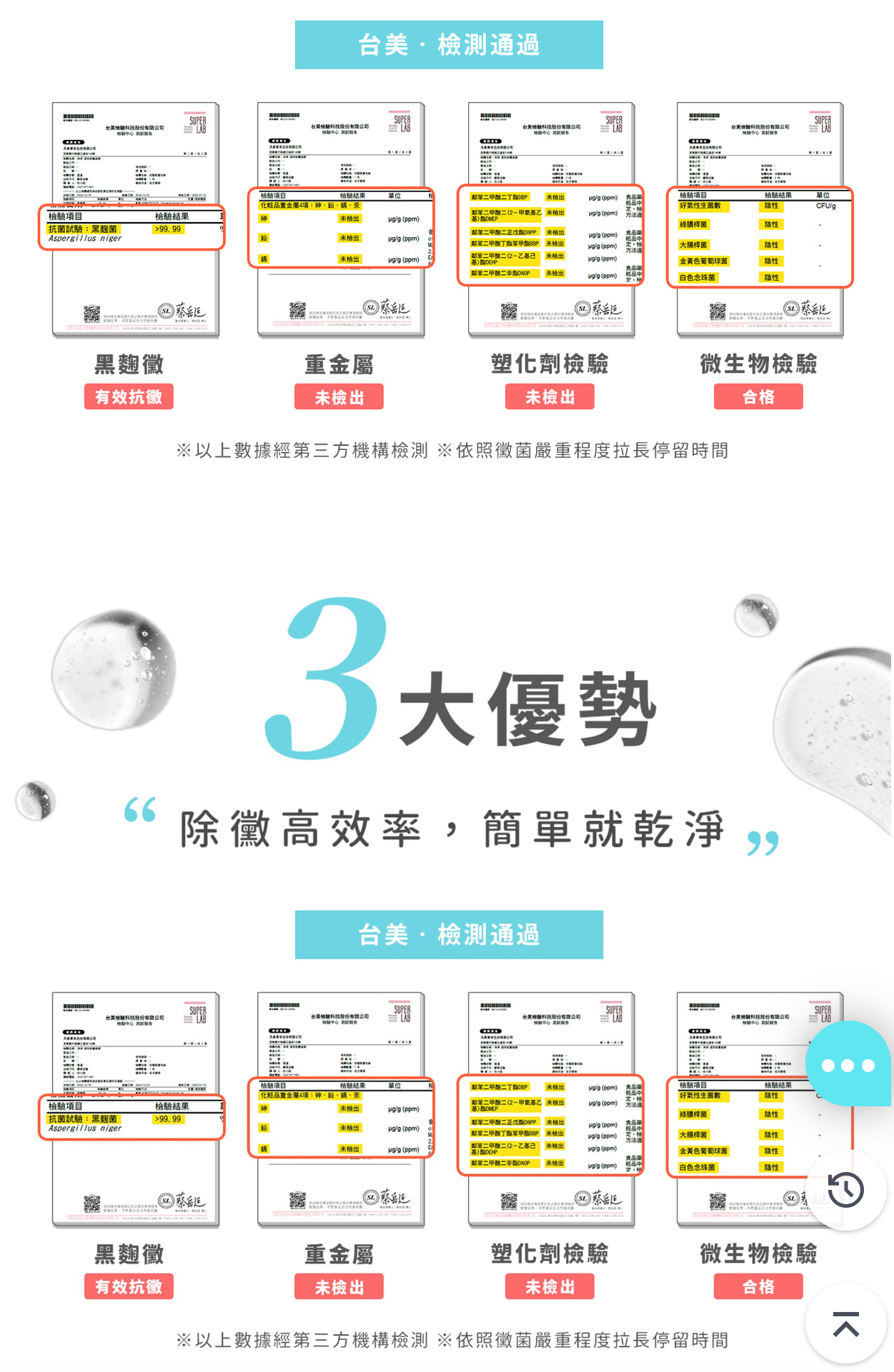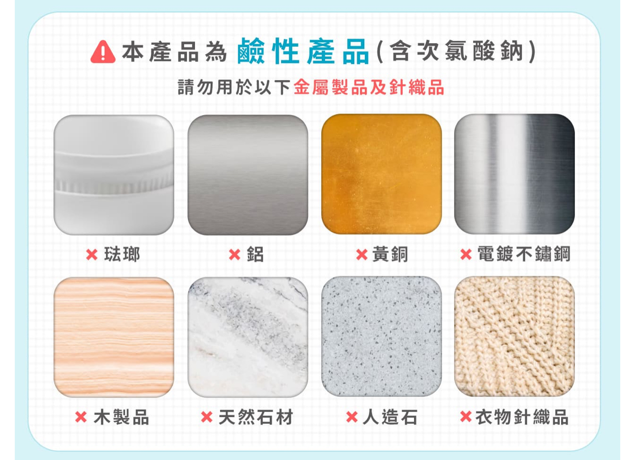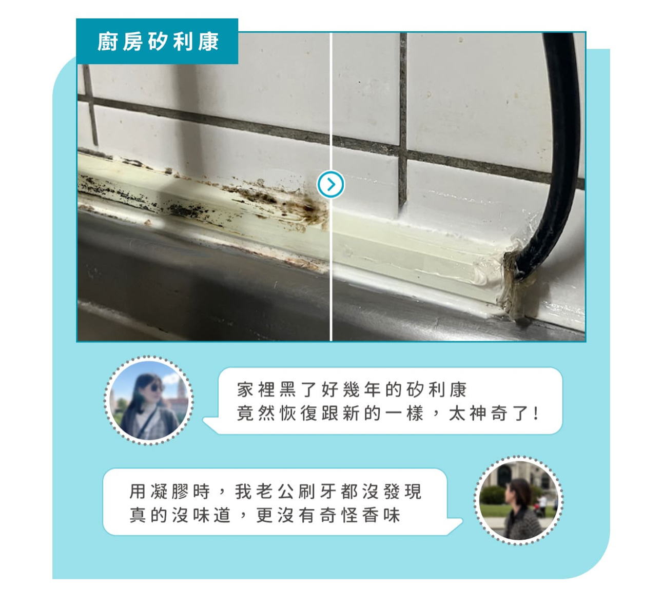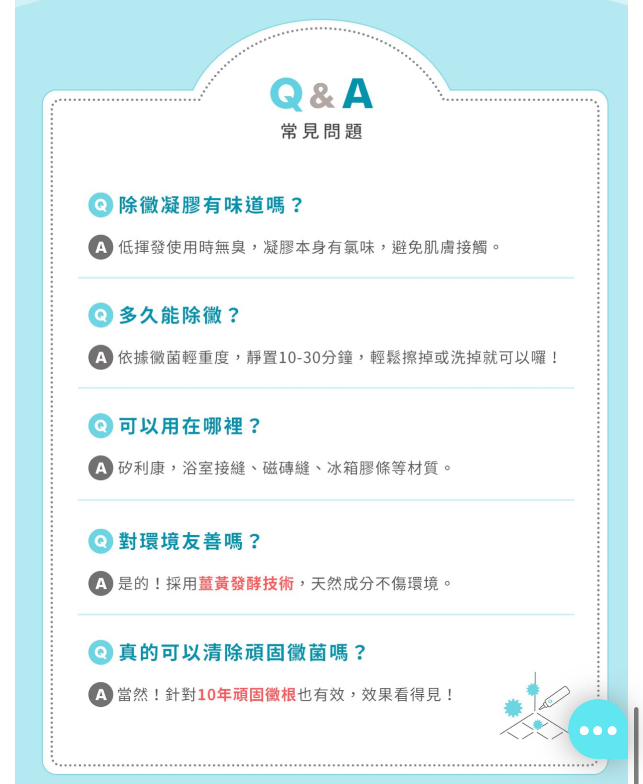 *不只擦掉表面黴菌,還能深入根部,乾淨持久看得見! *適用於矽利康、膠條、塑膠、磁磚縫等材質。 *超快速省時,塗上後靜置即可,不需刷、搓。 *無臭安心,使用過程無刺激氣味、香精遮蓋。 *尖嘴設計,縫隙、角落、膠條出膠精準塗抹。 = 品名 速效除黴凝膠 150ml 容量 150ML 產地 台灣 成分 次氯酸鈉 適用範圍 浴室、廚房等磁磚間隙,矽利康、塑膠膠條等發黴處。 使用建議 1.使用前請保持表面乾燥。 2.擠出適量凝膠塗抹在黴斑處。 3.靜置10-30分鐘(視黴斑嚴重程度) 4.清水洗淨即可。 保存方法 請置於陰涼乾燥處,避免陽光直射,以防變質。 ★注意事項★ *使用前先將、表面污垢擦掉,並保持目標處乾燥,再上除黴凝膠效果會更好呦! *除黴凝膠為「鹼性產品」,不適用電鍍、不鏽鋼、鋁等金屬製品、天然石材、人造石、琺瑯等材質,使用前請務必留意材質限制。 其他注意事項: 1.開封後盡速使用完畢。 2.本產品為鹼性,請避免與其他洗滌產品混合使用。 3.請勿使用於壁紙、木頭、金屬等材質處。 4.使用時請帶手套,避免接觸皮膚。 5.若滴入眼睛,請立即用水沖洗,仍有不適請洽詢專業醫師。