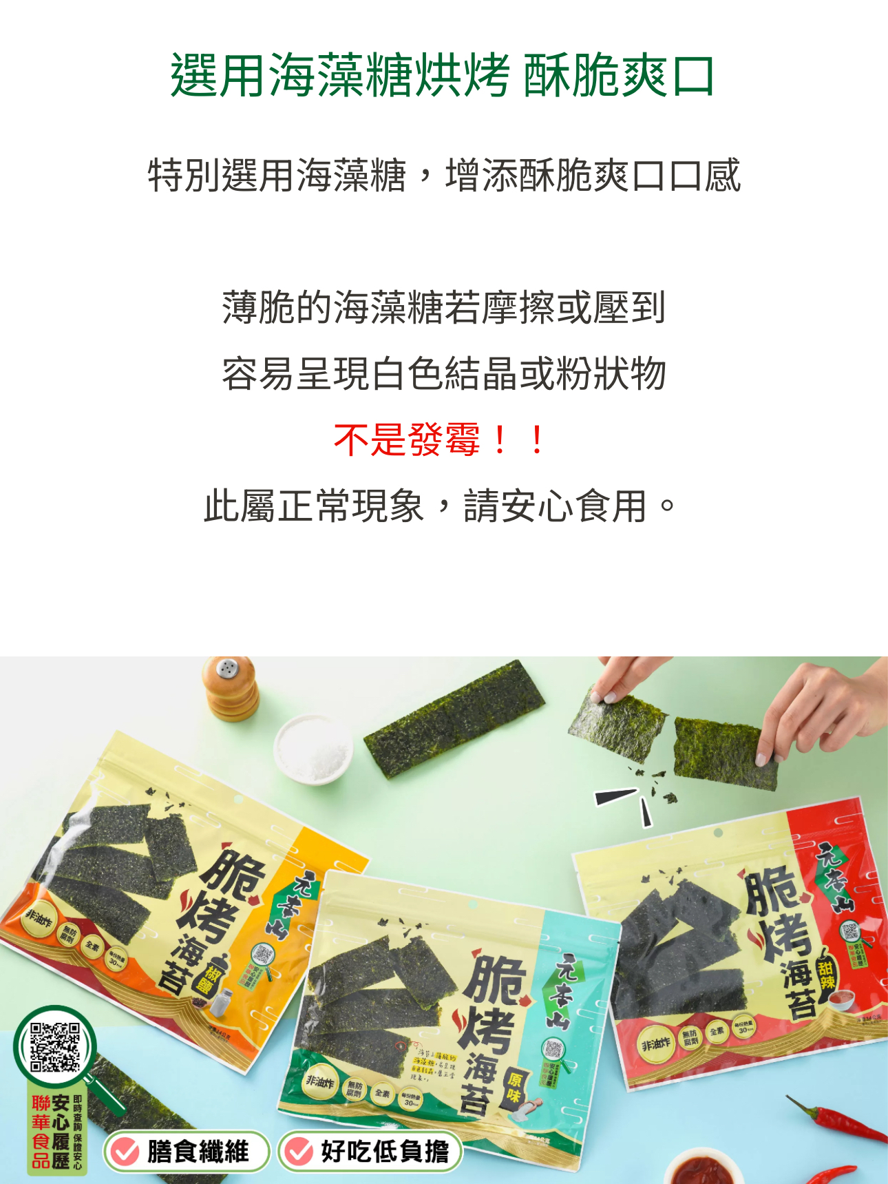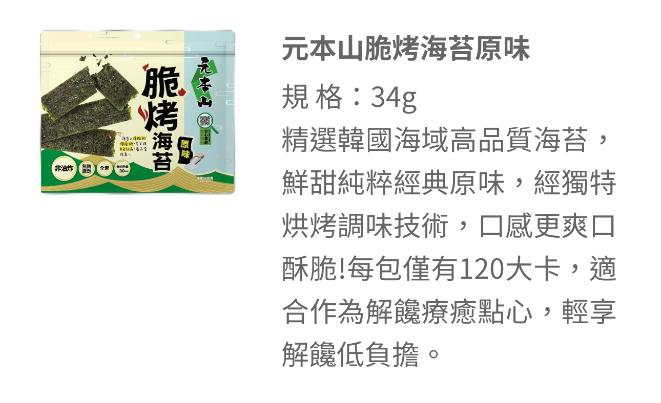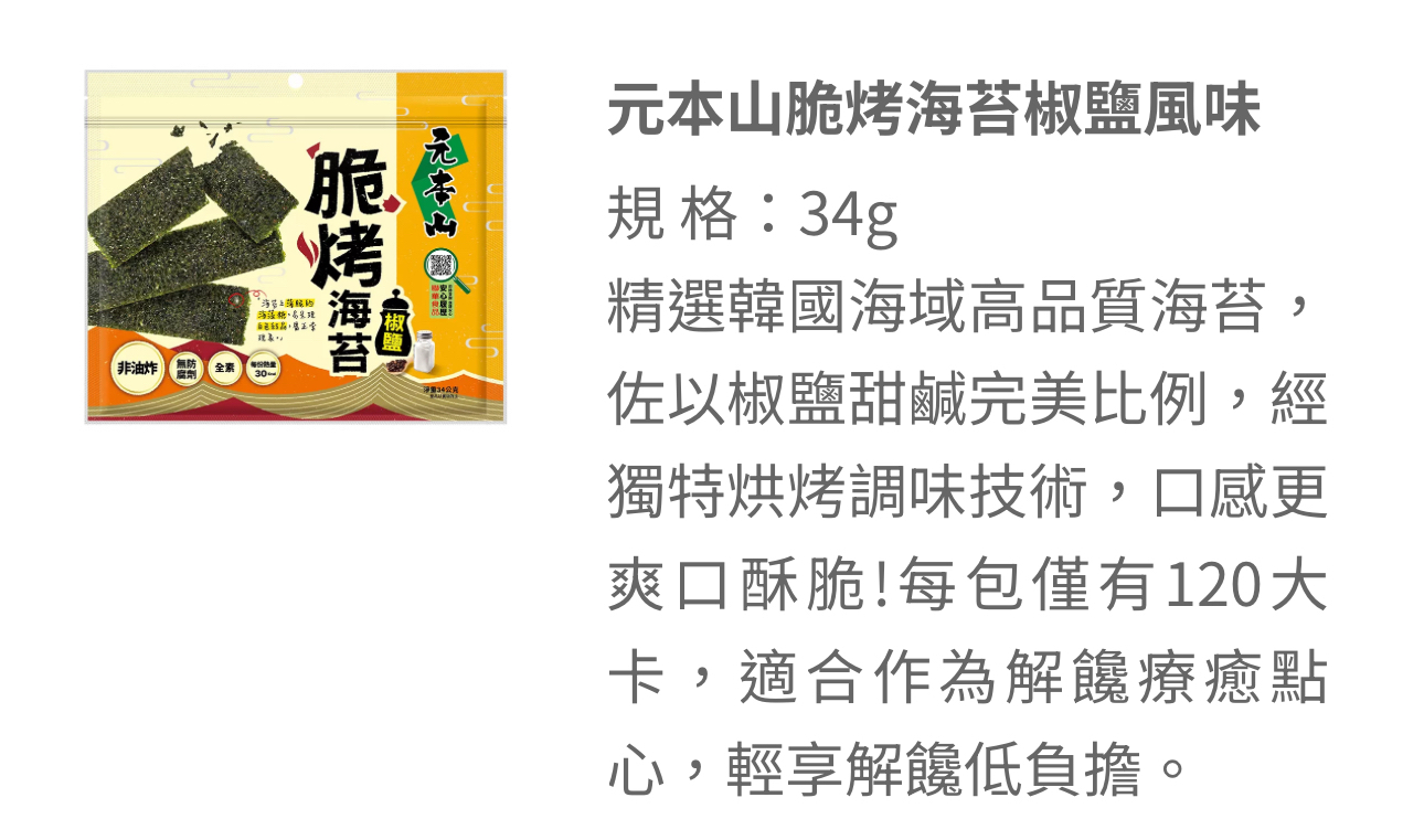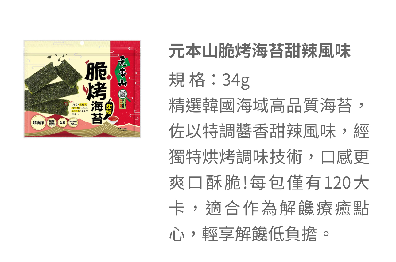 【大隻團購】脆烤海苔🌊 元本山海苔深受團友喜愛,全新產品— 脆烤海苔酥脆度更強,會一片接一片吃不停! 切成條狀的韓國海苔刷上薄糖,不經油炸,反而以控溫烘烤,爽脆涮嘴不油膩! 椒鹽和甜辣的調味蠻重,但甜辣的辣度很低,連大隻B都能吃~ 還跟老母搶😒 雖然重口味,每包熱量卻只有120大卡,又有膳食纖維,美味低負擔🥰