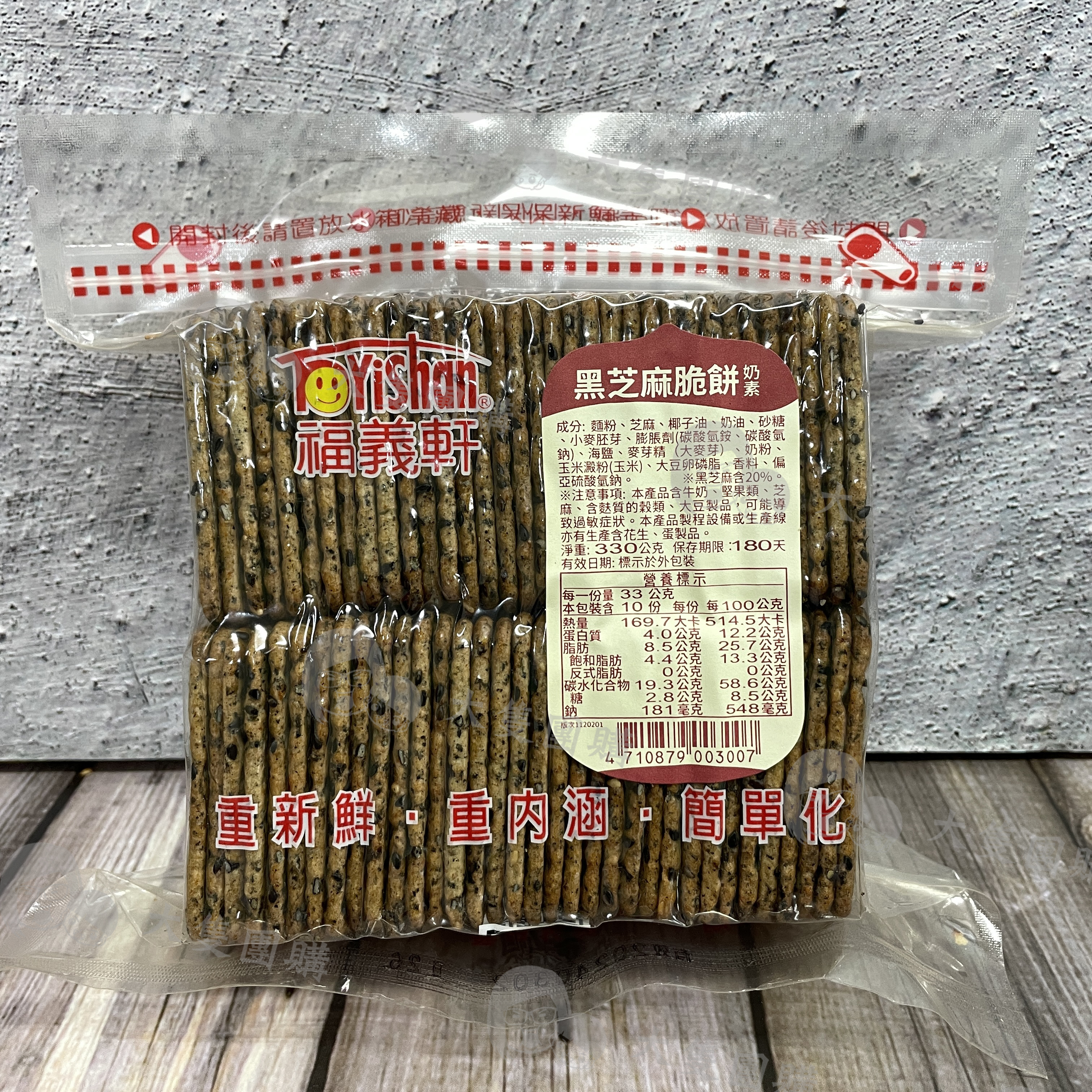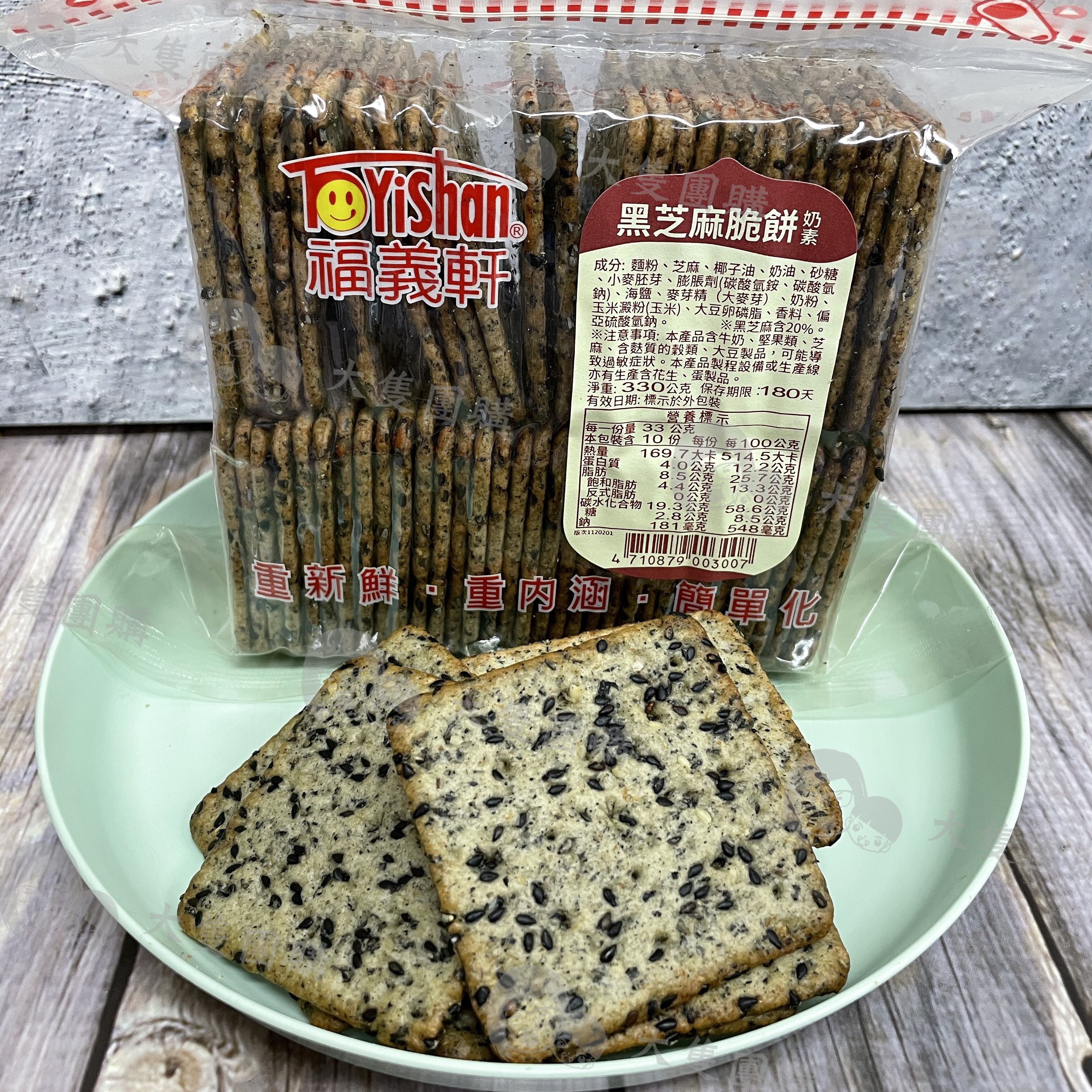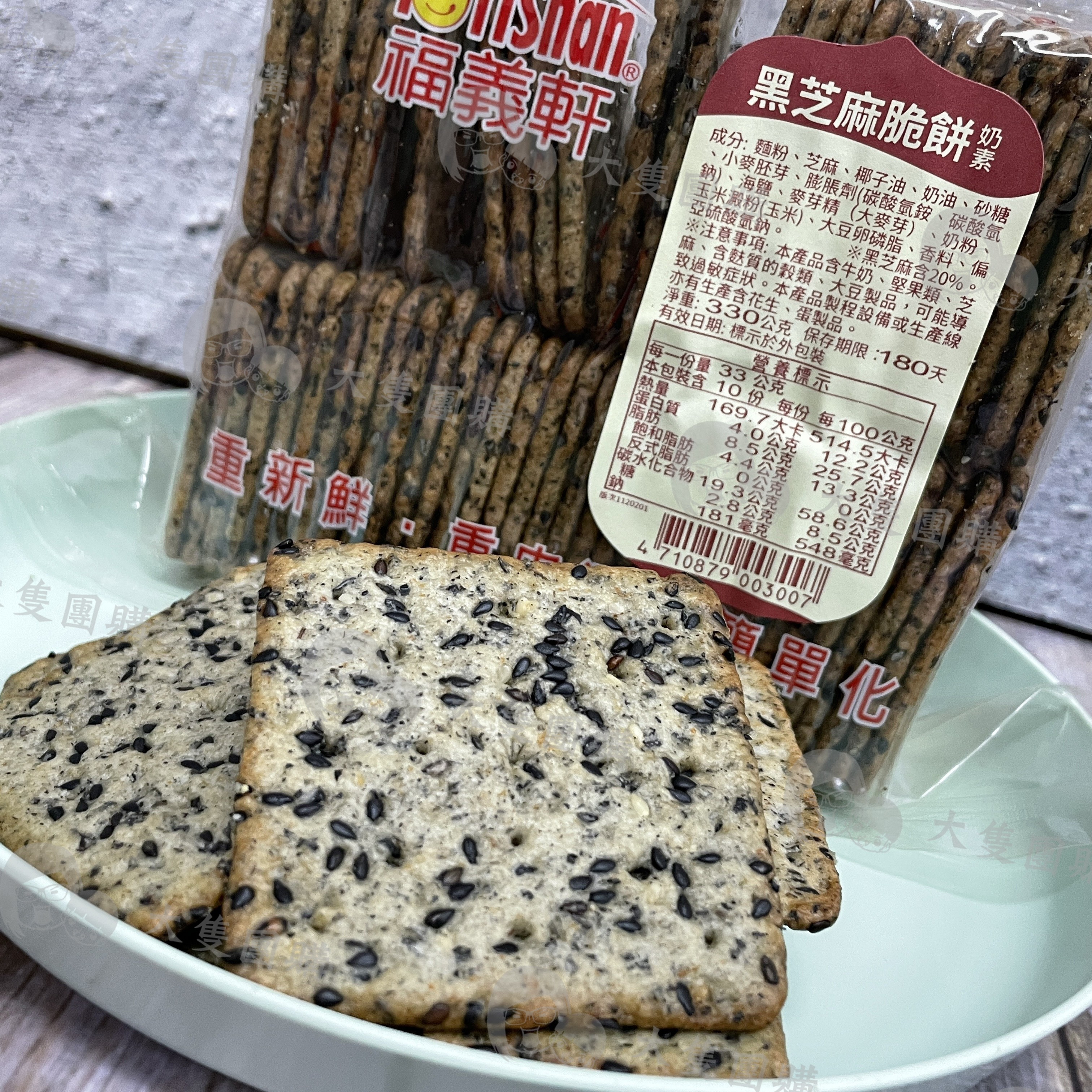 店家介紹: 芝麻香氣除了來自麵糰裡的芝麻粉之外,更精選黑芝麻顆粒,滿佈於餅體上,透過隧道烤爐的均勻烘烤,天然飽滿的芝麻香,完美釋放。獨特的硬脆口感,不過度調味,呈現自然食材美感,幾經咀嚼,在清香中能品嚐到一種恬淡的優雅。 不但是台灣最長銷的經典餅乾,也是外銷市場銷售的第一名。 產地:台灣
